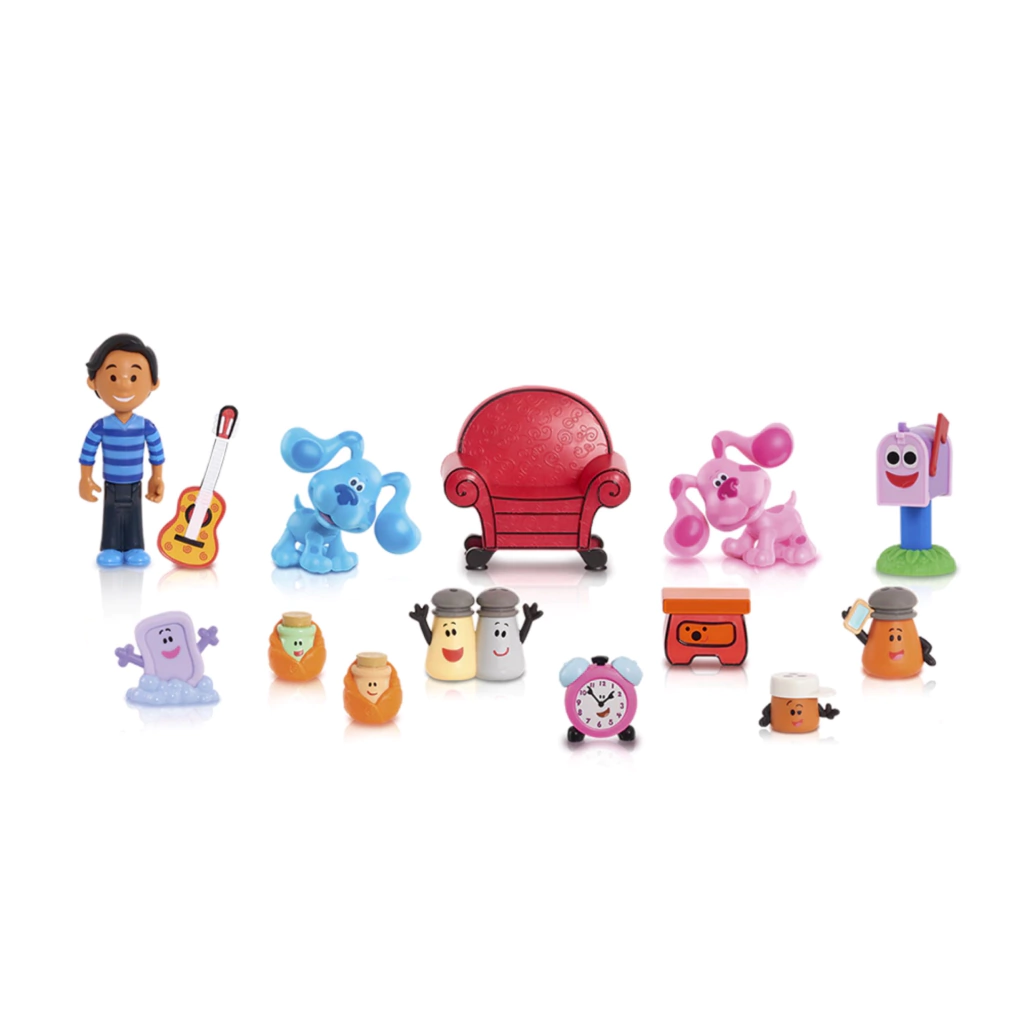 Los niños pueden reunir a todos sus amigos del exitoso programa preescolar de Nickelodeon con Blue s Clues & You! Blue, Magenta y Josh se presentan como figuras articuladas. El set incluye la Handy Dandy Guitar de Josh, que puede usar. A los niños les encantará recrear sus juegos favoritos de Blue s Clues con Tickety Tock y Slippery Soap. El buzón incluso se abre para revelar una carta. Coloque a Josh en la silla de pensamiento junto al cajón de la mesa auxiliar. ¡El Sr. Salt y la Sra. Pepper, Cinnamon, Ginger y Sage también están incluidos!