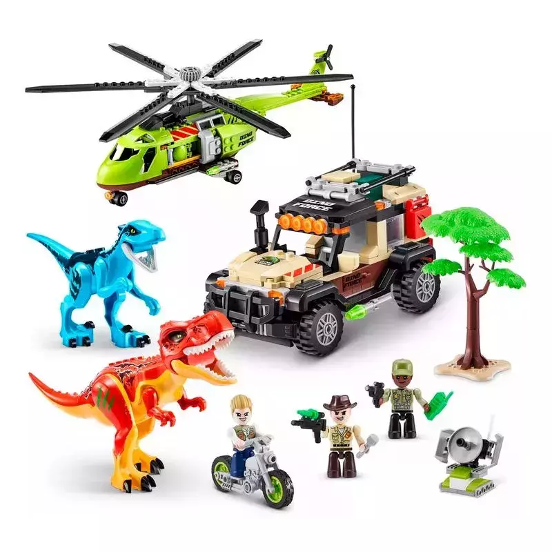 Este kit trae 592 piezas para construir 2 dinosaurios, 1 helicóptero, 1 camión, 1 motocicleta, 1 árbol y radares. Libera la motocicleta desde la parte trasera del helicóptero o camión para sumergirte en una persecución a toda velocidad y activa los brazos del dinosaurio para defenderse! Estos bloques son compatibles con las principales marcas de ladrillos.